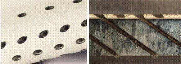 英國溫伯樂公司(Winbro)采用激光打孔技術(shù)對(duì)不同涂敷厚度的熱障涂層進(jìn)行了不同角度激光打孔試驗(yàn)。通過優(yōu)化激光打孔和涂層涂覆工藝參數(shù)可以避免陶瓷面層分層和粘結(jié)層/高溫合金基體界面裂紋的產(chǎn)生。圖5為打孔后的熱障涂層表面和截面形貌照片。該工藝采用的GUI控制軟件可以讓每個(gè)脈沖具有不同的激光參數(shù)。在陶瓷面層打孔時(shí)使用正確的峰值功率/脈沖能量組合以降低激光束能量對(duì)界面的熱損傷,當(dāng)打到基體時(shí)應(yīng)采用足夠高的峰值功率,以便在很短的時(shí)間內(nèi)完成打孔,減少氣膜孔孔徑內(nèi)重熔層的產(chǎn)生。據(jù)了解,Winbro公司對(duì)燃燒室涂層(基體2mm厚,涂層0.35mm厚)進(jìn)行20°、0.52mm直徑氣膜孔加工時(shí),重熔層平均厚度為20μm TBC;對(duì)渦輪葉片涂層(基體3mm厚,涂層0.65mm厚)進(jìn)行30°、0.65mm直徑氣膜孔加工時(shí),重熔層平均厚度為29μm 。
